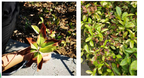 北方地區(qū)日照強(qiáng)度大,空氣濕度相對(duì)較較低,日灼現(xiàn)象十分明顯,紅葉石楠葉片邊緣受高溫影響大量失水導(dǎo)致葉片皺縮卷邊,開(kāi)始枯黃,嚴(yán)重影響景觀效果。