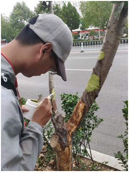 涂抹殺菌劑兩周后,針對(duì)枝干,仍要使用扮綠100倍+綠比多500倍噴淋。