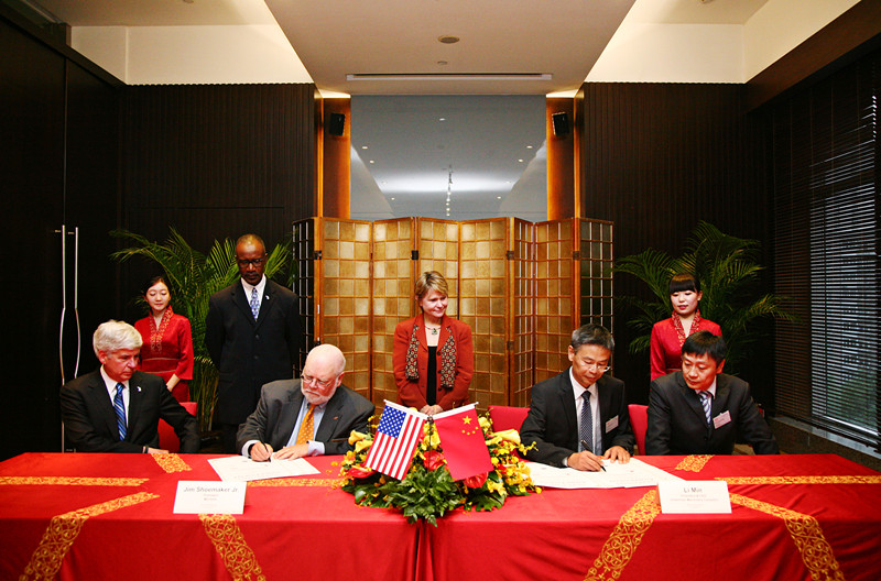 2013年9月11日晚6:10分,美國(guó)木霸克粉碎機(jī)公司與綠友集團(tuán)的簽約儀式在北京洲際大飯店(金融街)水晶廳舉行。美國(guó)密西根州州長(zhǎng)Rick Snyder(里克·斯奈德)先生及密西根州政府一行人,木霸克公司總裁James W. Shoemaker Jr. (詹姆斯·舒梅克)先生、木霸克公司市場(chǎng)營(yíng)銷副總裁John Foote(約翰·富特)先生、木霸克公司國(guó)際銷售經(jīng)理Ryan Sanders(瑞安·桑德斯 )先生、Curt McMullen(科特·麥克姆倫)先生、綠友集團(tuán)總裁李敏先生、副總裁劉軍先生、總裁助理和新先生參加了簽約儀式。