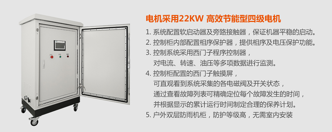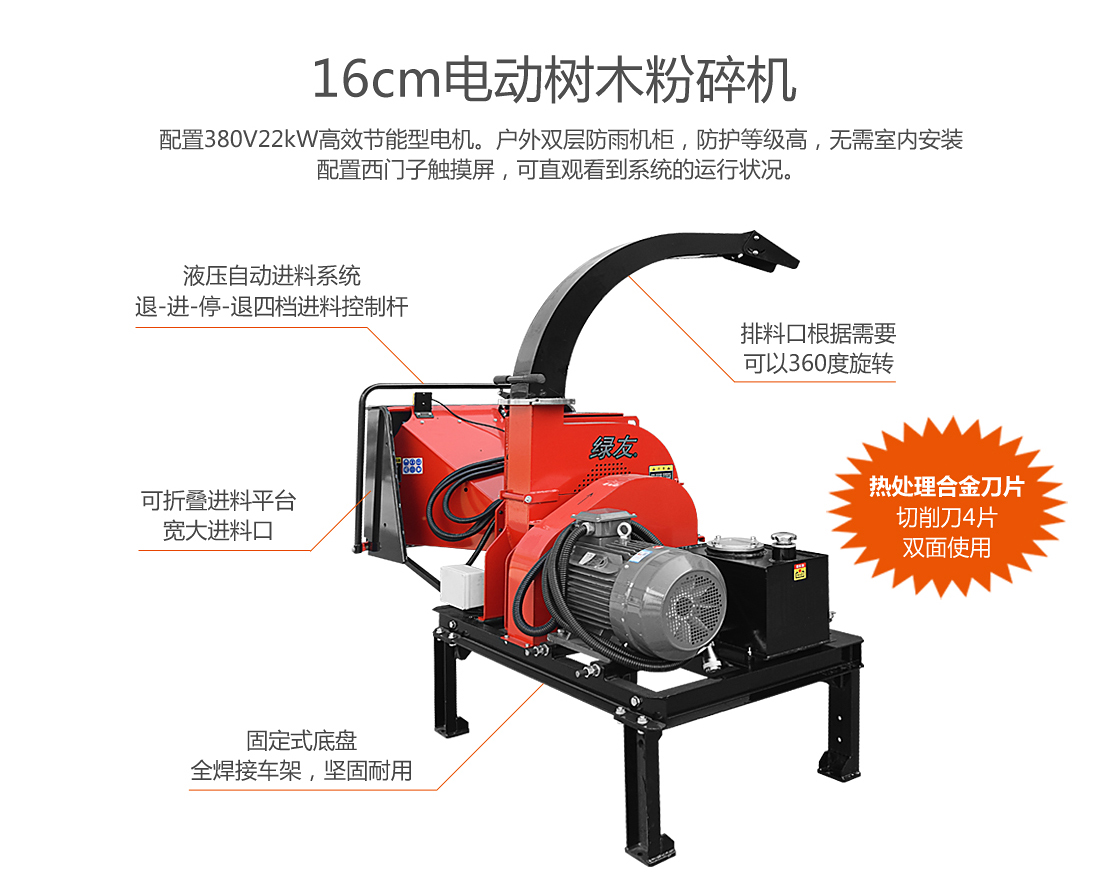 16cm電動粉碎機,配置380V22kW高效節(jié)能型電機。戶外雙層防雨機柜,防護等級高,無需室內(nèi)安裝;配置西門子觸摸屏,可直觀看到系統(tǒng)的運行狀況。